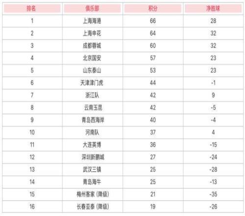 中超30輪積分榜:海港積66分奪冠梅州亞泰降級(jí)