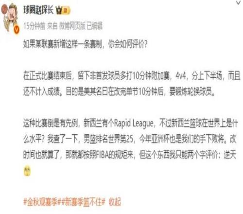 就在眾多媒體人和球迷還在熱議時間縮短的問題的時候,媒體人“球圈趙探長”又放出了猛料,表示“某聯(lián)賽”正在醞釀增加一條賽制,那就是在正式比賽結束后,兩隊的非首發(fā)球員還要留下來打10分鐘的4V4比賽,分為上下半場且不計入成績。這樣的做法,美其名曰是鍛煉輪換球員。至于這個“某聯(lián)賽”是哪個聯(lián)賽,雖然“球圈趙探長”并沒有明說,但球迷們都清楚,就是說的CBA聯(lián)賽。隨后有知情人透露,籃協(xié)方面正在商討這一做法,只不過目前還沒有最終確定。對于籃協(xié)的這個想法,“球圈趙探長”用兩個字進行了評價:逆天!