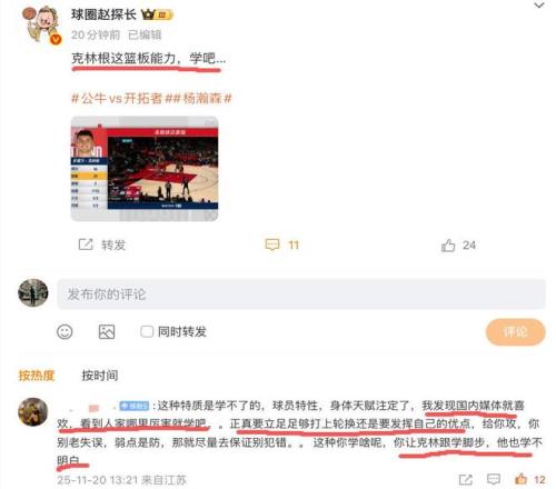 之前對(duì)陣公牛的比賽,克林根全場(chǎng)拿下17分21籃板4助攻,當(dāng)時(shí)有媒體人就在社媒寫(xiě)道:“克林根這籃板能力,學(xué)吧。”不過(guò)不少理性的球迷還是不太買(mǎi)賬:“這種特質(zhì)是學(xué)不了的,球員特性,身體天賦注定了,我發(fā)現(xiàn)國(guó)內(nèi)媒體就喜歡,看到人家哪里厲害就學(xué)吧。真要立足足夠打上輪換還是要發(fā)揮自己的優(yōu)點(diǎn),給你攻,你別老失誤,弱點(diǎn)是防,那就盡量去保證別犯錯(cuò)。這種你學(xué)啥呢,你讓克林根學(xué)腳步,他也學(xué)不明白?!?/p>