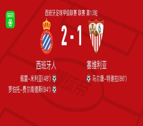 北京時(shí)間11月25日,西班牙足球甲級(jí)聯(lián)賽第13輪展開角逐,西班牙人坐鎮(zhèn)主場(chǎng)迎戰(zhàn)塞維利亞。比賽中,西班牙人率先打破僵局,佩雷-米利亞接多蘭的助攻后破門得分,為主隊(duì)取得領(lǐng)先。隨后,烏爾科-岡薩雷斯送出助攻,羅伯托-費(fèi)爾南德斯冷靜施射建功,進(jìn)一步擴(kuò)大比分優(yōu)勢(shì)。臨近比賽尾聲,塞維利亞由加布里埃爾-蘇亞索助攻馬爾康-特謝拉扳回一球,但未能扭轉(zhuǎn)局勢(shì)。最終,西班牙人以2比1戰(zhàn)勝塞維利亞,全取三分。