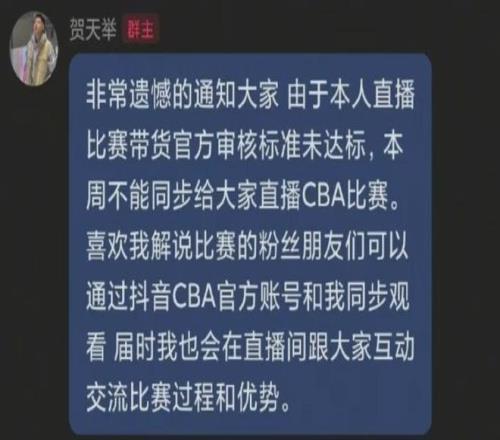 舉個最簡單的例子,昨晚遼籃名宿賀天舉在自己的粉絲群里說,因?yàn)樗谵D(zhuǎn)播時的帶貨銷量不達(dá)標(biāo),暫時失去了個人抖音賬號直播CBA比賽的資格。