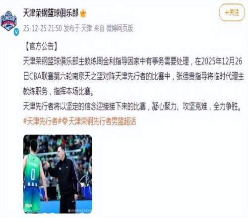沒(méi)錯(cuò),這就是天津榮鋼籃球俱樂(lè)部,昨晚深夜,他們官宣:主教練周金利指導(dǎo)因家中有事務(wù)需要處理,在2025年12月26日CBA聯(lián)賽第六輪南京天之藍(lán)對(duì)陣天津先行者的比賽中,張德貴指導(dǎo)將臨時(shí)代理主教練職務(wù),指揮本場(chǎng)比賽。大家懂得都懂,很多俱樂(lè)部對(duì)教練下課,都用家中有事或是身體不適來(lái)表述。顯然周金利教練并不是因?yàn)榧抑杏惺?,而是切切?shí)實(shí)的下課了。