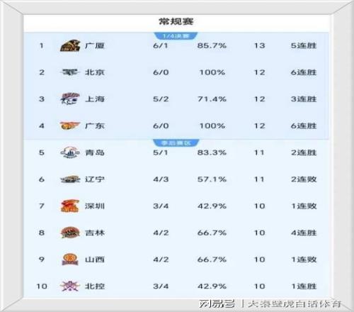 ①、拿到5連勝的衛(wèi)冕冠軍廣廈男籃,憑借先勝一輪的優(yōu)勢(shì),以6勝1負(fù)的戰(zhàn)績(jī)力壓北京男籃和廣東男籃,排名榜首;
