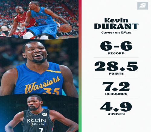 杜蘭特圣誕大戰(zhàn)6勝6負,場均能得到27.2分6.9板4.4助